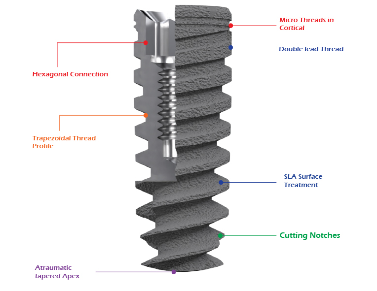 The Implant is built strong and stable body with durable blades that collect at the corners convene the softbone and compressing it during implantation to ensure the uniform and high quality platform for connecting the bone graft.